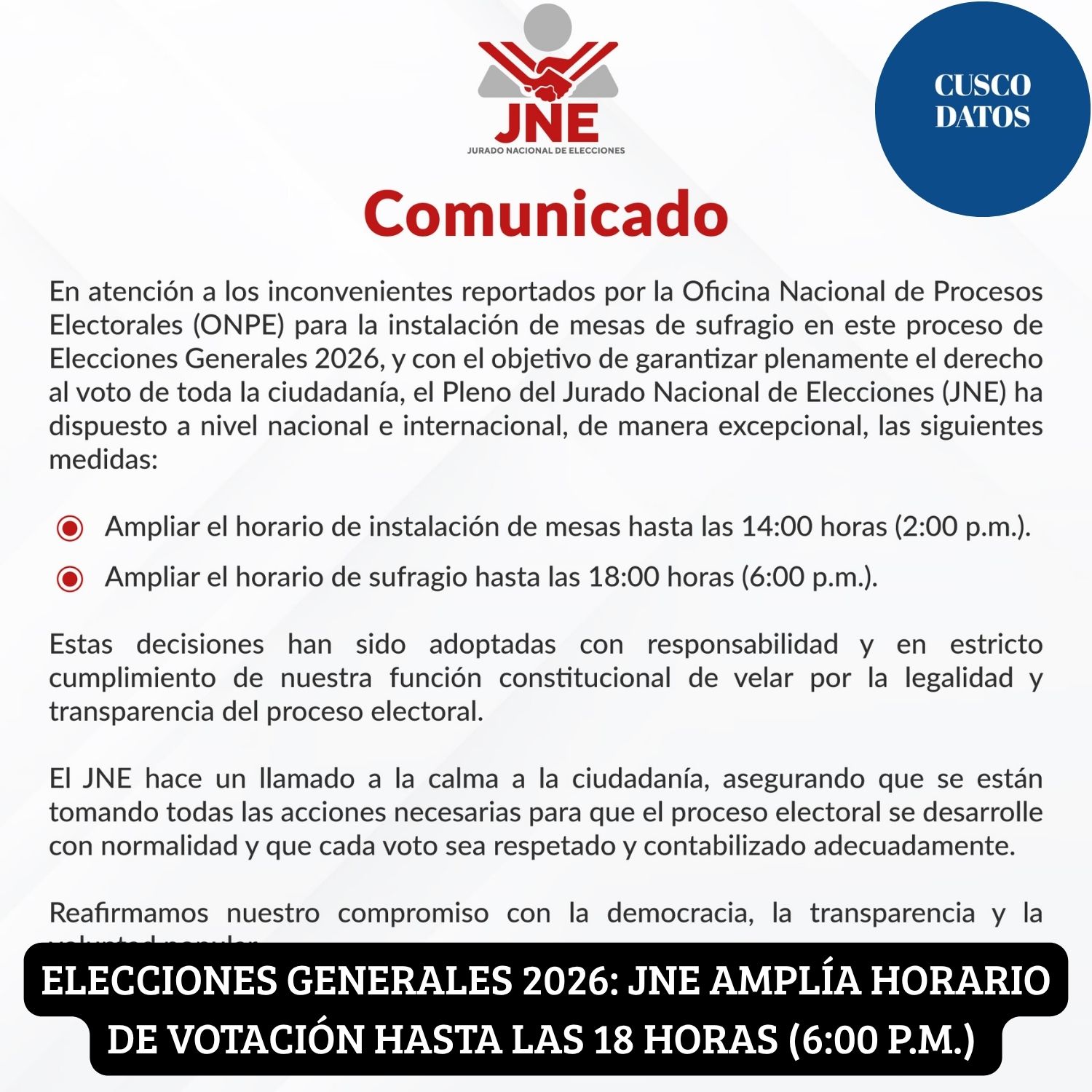 El Pleno del Jurado Nacional de Elecciones dispuso, de manera excepcional, extender el sufragio hasta las 18 horas y la instalación de mesas hasta las 2 p.m., con el fin de garantizar que ningún ciudadano se quede sin votar.