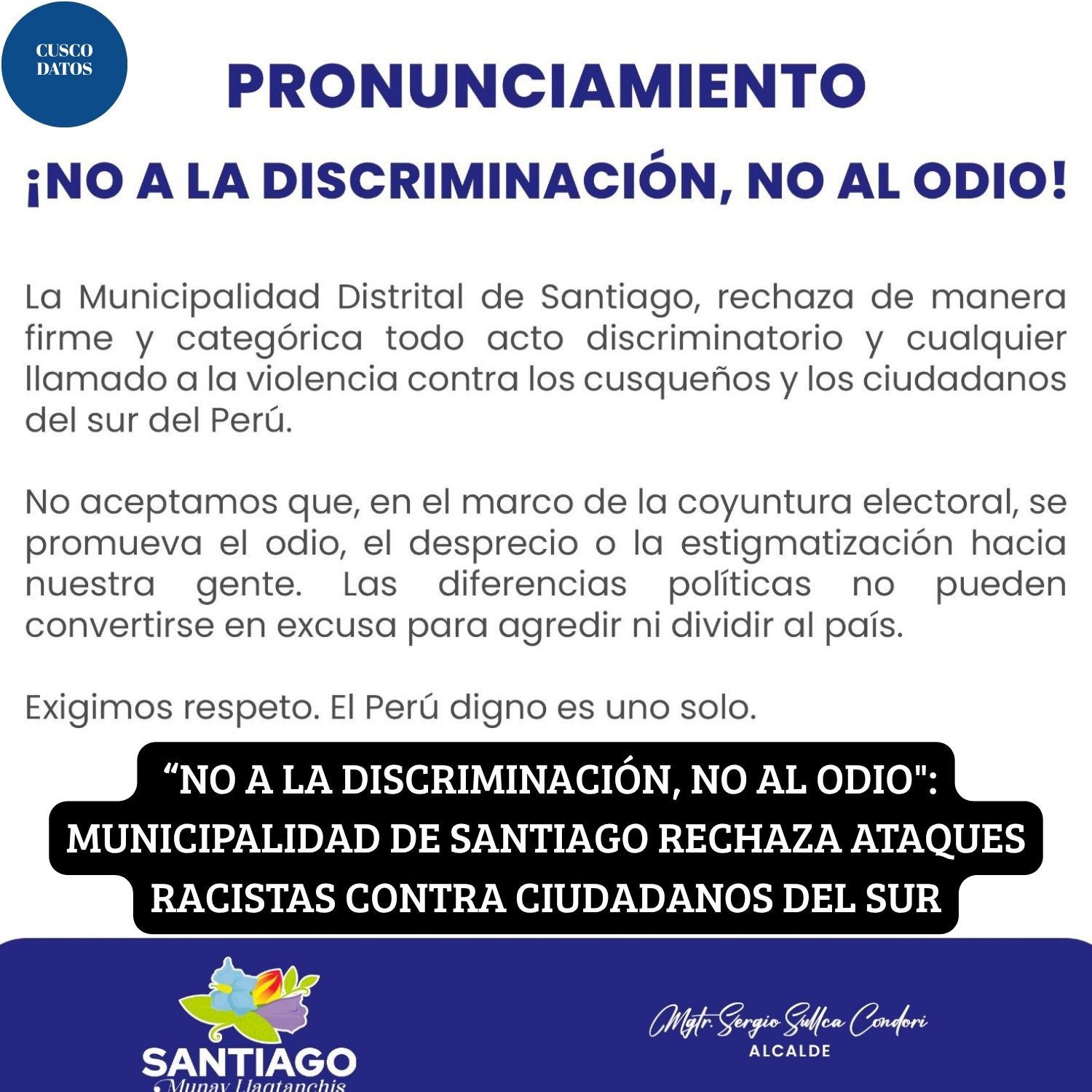 La comuna distrital emitió un pronunciamiento público luego de que ciudadanos del sur del Perú fueran blanco de mensajes racistas y clasistas en Lima por haber votado en las Elecciones Generales del 12 de abril