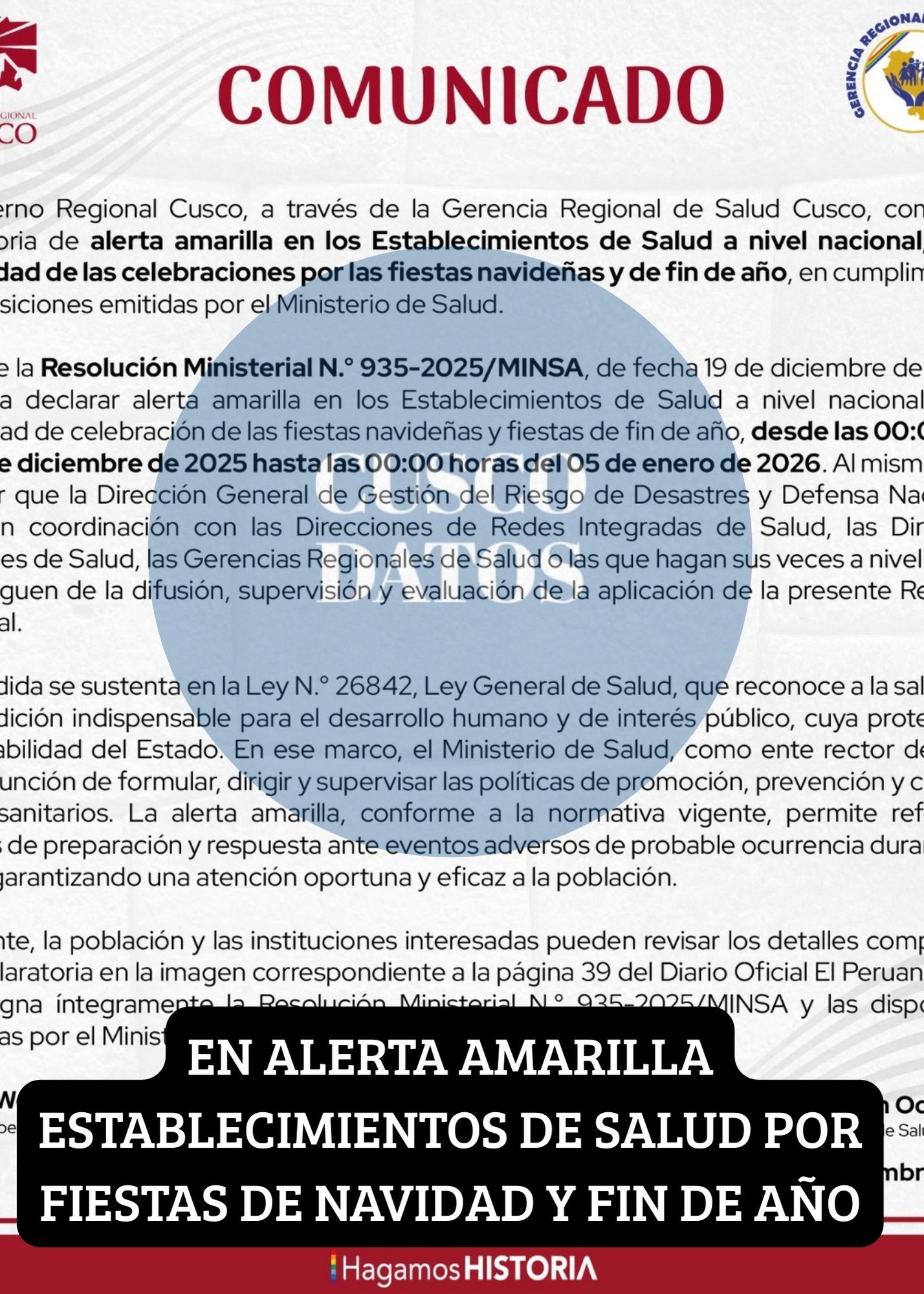 La medida fue formalizada mediante la Resolución Ministerial N.° 935-2025/MINSA, publicada el 19 de diciembre en el Diario Oficial El Peruano. Dicha resolución establece la alerta amarilla desde las 00:00 horas del 20 de diciembre de 2025 hasta las 00:00 horas del 05 de enero de 2026.