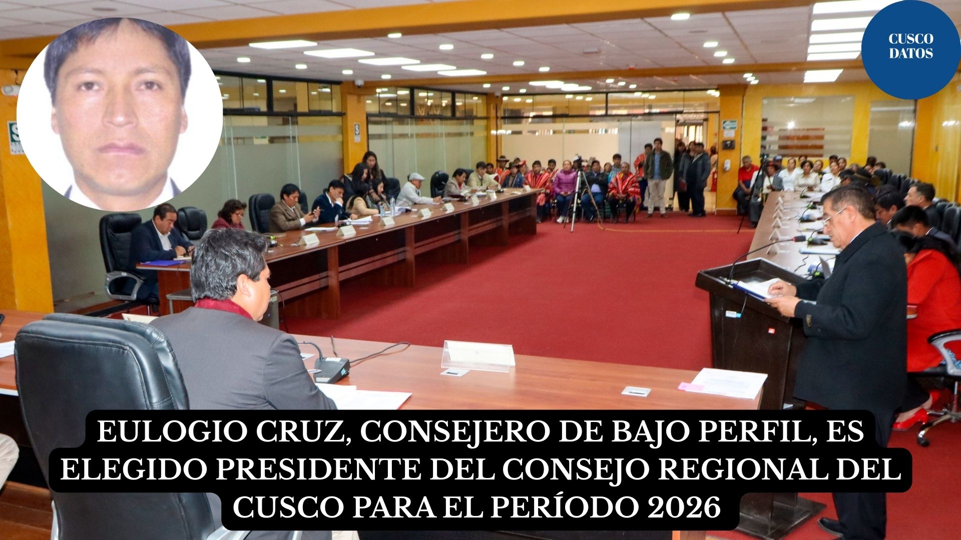 #CuscoDatos. En una sesión ordinaria marcada por tensiones y exabruptos verbales, el Consejo Regional del Cusco eligió a su nueva directiva para el próximo año. El cargo de presidente recayó en el consejero por Quispicanchi, Eulogio Cruz Cartagena, una figura de bajo perfil y su escasa o desconocida labor fiscalizadora durante su gestión.