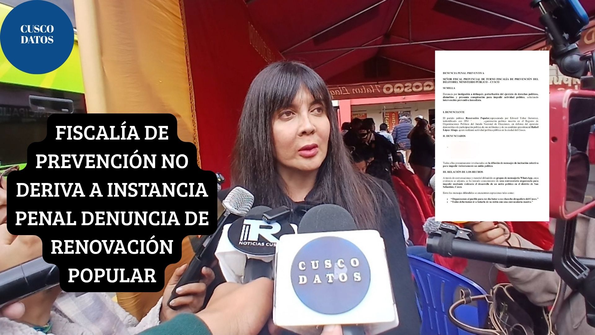 #CuscoDatos. La Fiscalía de Prevención del Delito del Cusco decidió no derivar a la instancia penal la denuncia presentada por Renovación Popular contra tres personas, presuntamente vinculadas a una convocatoria para obstaculizar con violencia el mitin del candidato Rafael López Aliara, realizado el pasado 14 de marzo en la plaza de San Sebastián. La fiscal Emma Arteaga informó que, tras las diligencias correspondientes, se optó por realizar una exhortación a los denunciados a fin de que eviten hechos violentos en la actividad política del candidato López Aliaga. Como parte de las acciones preventivas, el Ministerio Público coordinó con la Policía Nacional para reforzar el resguardo durante el mitin. En la jornada, se registró una protesta en repudio a la presencia del candidato, donde se desplegó un importante número de efectivos del orden. La Fiscalía también recepcionó un informe policial en el que se señala que no se reportó ninguna afectación a la integridad de los asistentes al mitin, lo que llevó a que la denuncia quedara sin trámite penal. DENUNCIA La denuncia fue interpuesta por Edward Yábar, candidato al Congreso por Renovación Popular, quien representó a la agrupación política. Yábar advirtió que, a través de conversaciones y material difundido en grupos de WhatsApp, se habría tomado conocimiento de una convocatoria para impedir mediante “violencia” el desarrollo del mitin en el distrito de San Sebastián. El denunciante señaló que existía una convocatoria directa para recurrir a la violencia contra el evento. Por tal motivo, se presentó la denuncia contra tres personas. REPUDIO Si bien no se registraron hechos violentos durante el mitin del candidato de Renovación Popular, Rafael López Aliaga; sí se llevó a cabo una protesta en la plaza de San Sebastián, donde un grupo de personas expresó su repudio contra la presencia del líder de la agrupación política. La movilización se desarrolló sin incidentes que comprometieran la integridad de los asistentes.