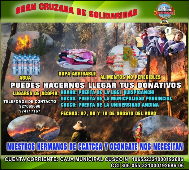 #APOYEMOS. Los integrantes de la Unidad de Gestión Educativa Local de Quispicanchi conjuntamente que profesores de este sector organizan la “Gran cruzada de solidaridad”, para apoyar a los pobladores de los distritos de Ccatca y Ocognate afectados por el incendio que segó la vida de ocho personas y quienes también padecen las consecuencias de la pandemia por el Covid-19.