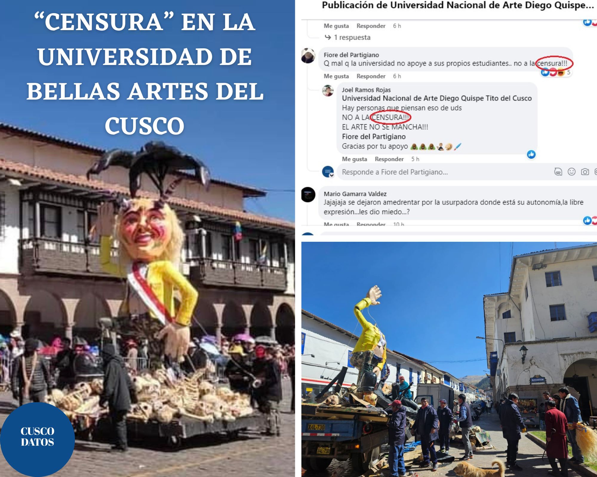 #CuscoDatos. La alegoría denominada “La Descarada”, en alusión al régimen de Dina Boluarte, elaborada por un grupo de estudiantes de la Universidad Nacional de Arte Diego Quispe Tito del Cusco, fue retirada de la plazoleta Espinar, al igual que "Dina Roedora", lo cual ha sido calificado como una “censura” en el fanpage de la casa de estudios superiores.
